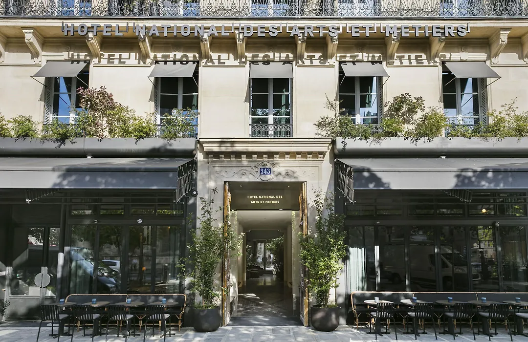 Hotel National Des Arts Et Metiers, a 4-star hotel rating 8.5/10 on Booking.com, features a rooftop bar with stunning views of iconic landmarks. The hotel combines classic Haussmann architecture with modern design, situated in the vibrant Montorgueil district.