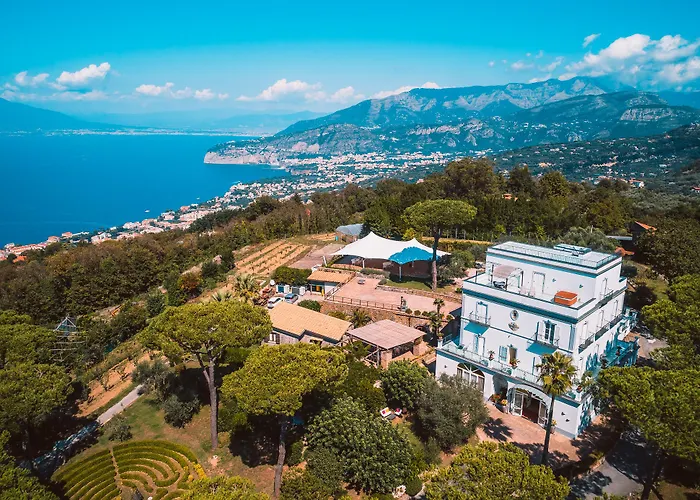 Oasi Olimpia Relais, a 5-star hotel with a 9.6/10 rating, offers panoramic views of the Bay of Naples and is surrounded by a vast Mediterranean garden. This boutique hotel features a large swimming pool, a restaurant serving organic Mediterranean cuisine, and the option for exclusive villa rental.