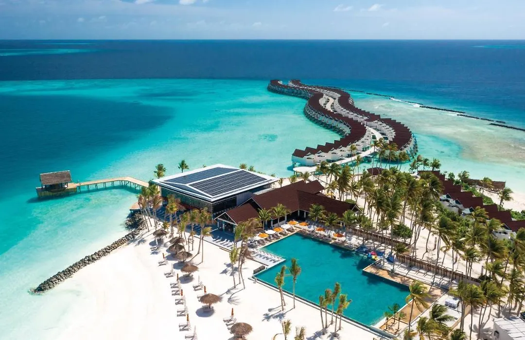 Oblu Xperience Ailafushi, a 4-star hotel, offers all-inclusive amenities and contemporary accommodations tailored for families and modern travelers. Facilities include an outdoor swimming pool, fitness center, and a restaurant serving local and international cuisine.