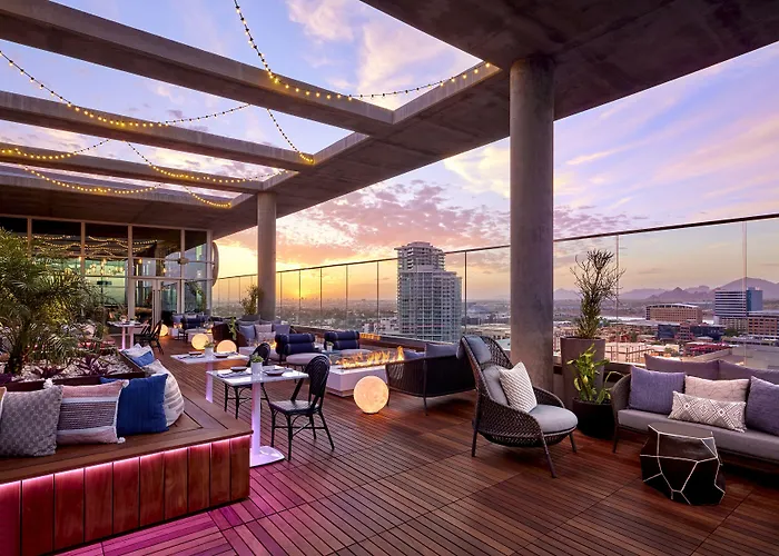 Omni Tempe Hotel At ASU (4-star, 9.0/10 on Booking.com) offers modern accommodations with a rooftop pool, bar, and restaurant, amplifying the downtown area. The hotel features 330 guest rooms and suites designed with a cool color palette inspired by the surrounding desert landscape.