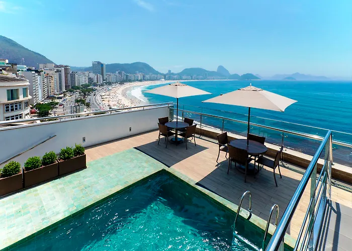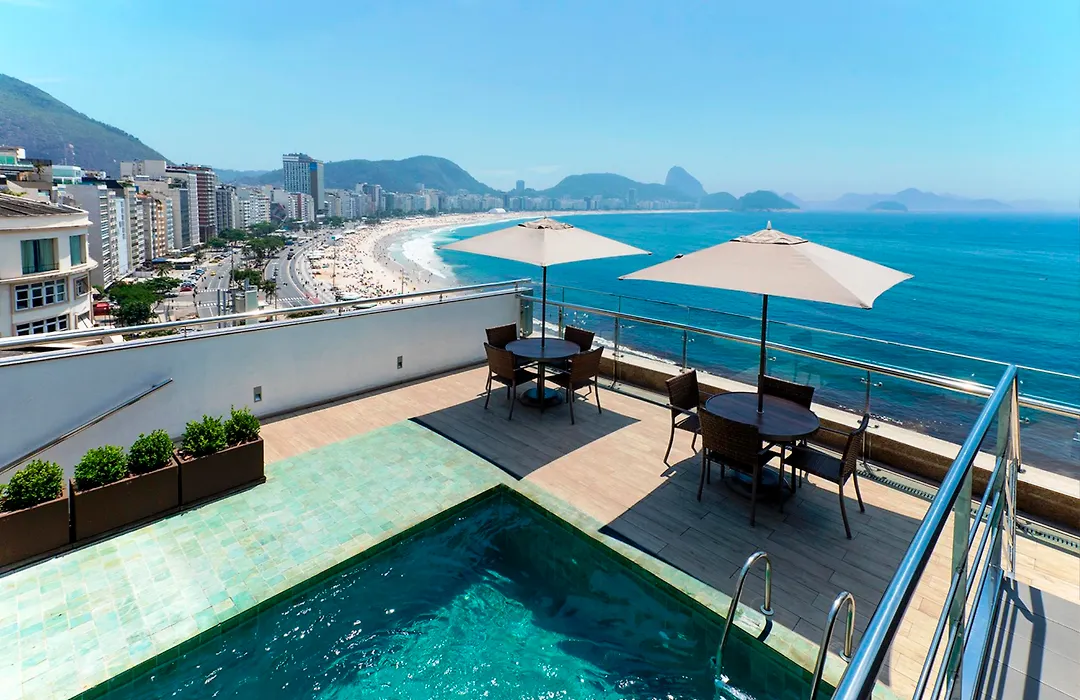 Orla Copacabana Hotel features a rooftop swimming pool, a health club, outdoor pool, sauna, and a fitness center with beach views. It is situated less than 10 minutes from Arpoador, known for its iconic sunset views.