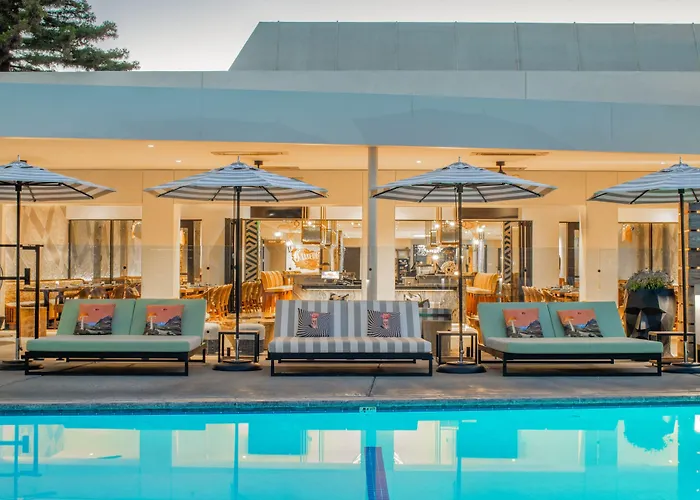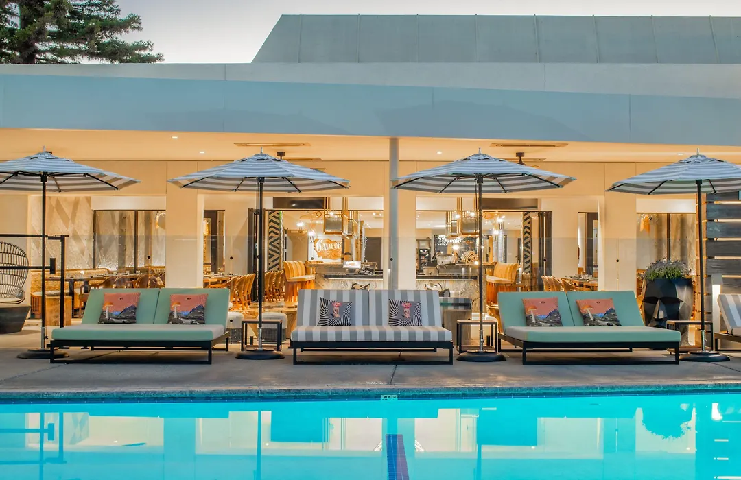 Dining options include Solaire Restaurant + Bar, where guests can enjoy modern American cuisine with views of the pool and surrounding redwoods. Poolside Cabana Lounge offers a semi-private venue for events and a special poolside menu. The breezeway features intimate outdoor seating.