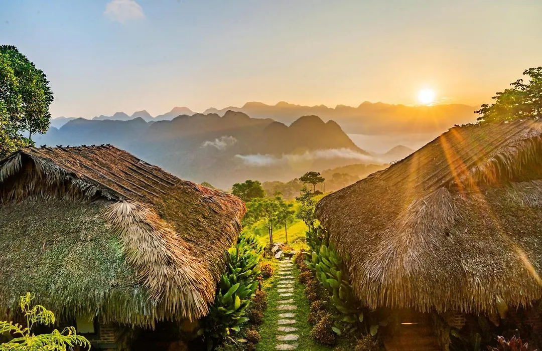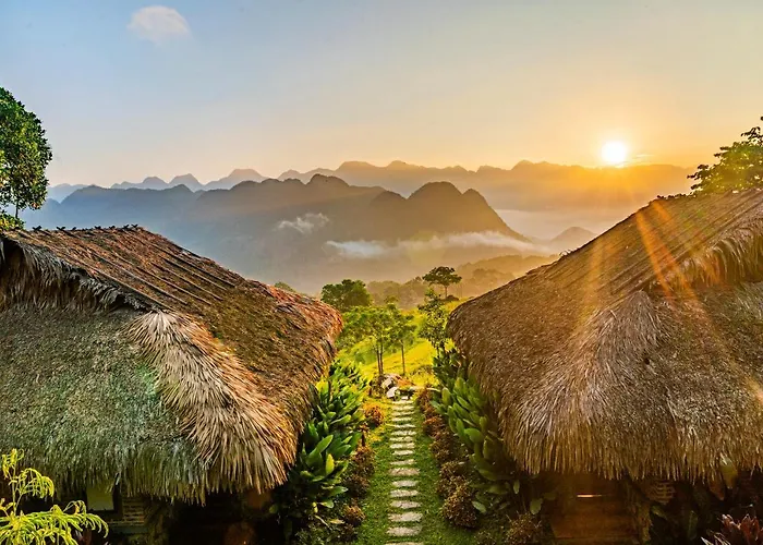 Puluong Retreat, a 4-star Pu Luong hotel with a 9.0/10 rating on Booking.com, offers stunning panoramic views and eco-friendly accommodations. The retreat features 31 bungalows and villas, two infinity pools, and on-site dining with authentic Asian cuisine.