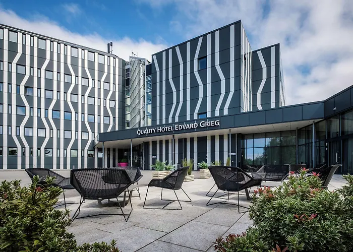 Quality Hotel Edvard Grieg offers spacious accommodations and modern facilities, including a gym with stunning views and a family-friendly atmosphere. This 4-star Bergen hotel has convenient access to the airport and is situated in a vibrant residential area known for parks and hiking trails.