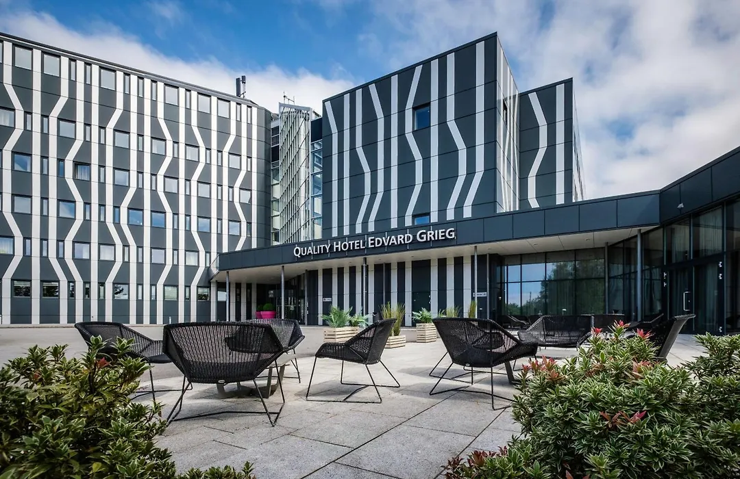 The Quality Hotel Edvard Grieg features 373 rooms, with options for family accommodations and allergy-friendly rooms. Amenities include a flat-screen TV, mini-bar, workspace with a desk, and a private bathroom with toiletries.
