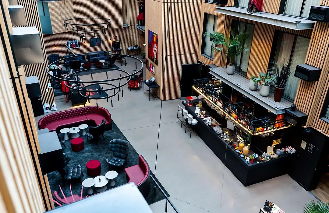Dining options at Radisson Red Aarhus are highlighted by the buzzing Atrium Bar & Restaurant, where guests can experience Danish hygge with delicious food. The hotel offers a complimentary coffee break with snacks for meetings and events. Nearby local restaurants like Elisa's Sandwich and Karma Sushi provide variety.