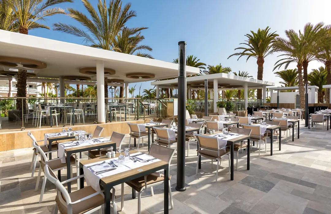 The dining options include three on-site restaurants where chefs prepare buffet breakfasts and dinners with live cooking stations featuring fusion cuisine and traditional Spanish dishes. Snack options and beverages are available at the bar and poolside.