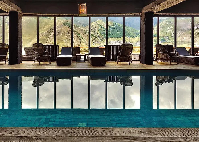 Rooms Hotel Kazbegi, a 5-star accommodation with an 8.6/10 rating on Booking.com, features stunning views of Mount Kazbeg and high-quality amenities. Guests can enjoy a unique blend of traditional Georgian hospitality and modern design, along with a spa, fitness center, and on-site dining options.