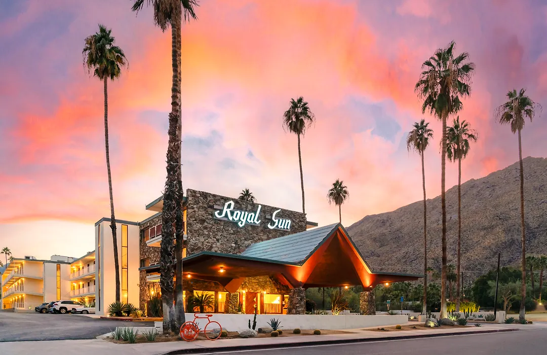 Royal Sun Palm Springs offers a relaxing escape with an outdoor pool and hot tub, featuring 4-star accommodations and an 8.5/10 rating on Booking.com. Guests enjoy California breakfast buffets with homemade breads and pastries.