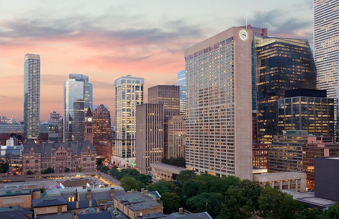 Sheraton Centre Toronto Hotel is a 4-star hotel in the financial district, featuring an upscale Sheraton Club Lounge with skyline views. Guests can enjoy landscaped gardens, a pool, and modern amenities including a fully equipped fitness center.