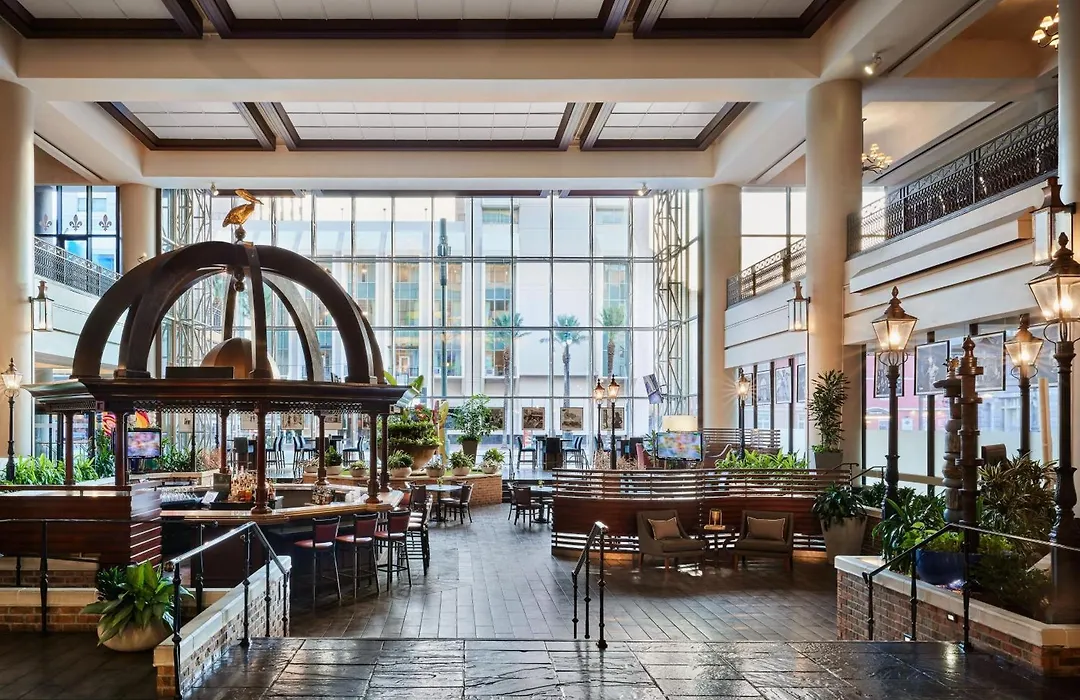 Dining options include the Roux Bistro, known for traditional New Orleans breakfast and Cajun and Creole cuisine. The Pelican Bar serves cocktails and bar food reminiscent of a French Quarter courtyard ambiance. An on-site Starbucks café is available for coffee and pastries.