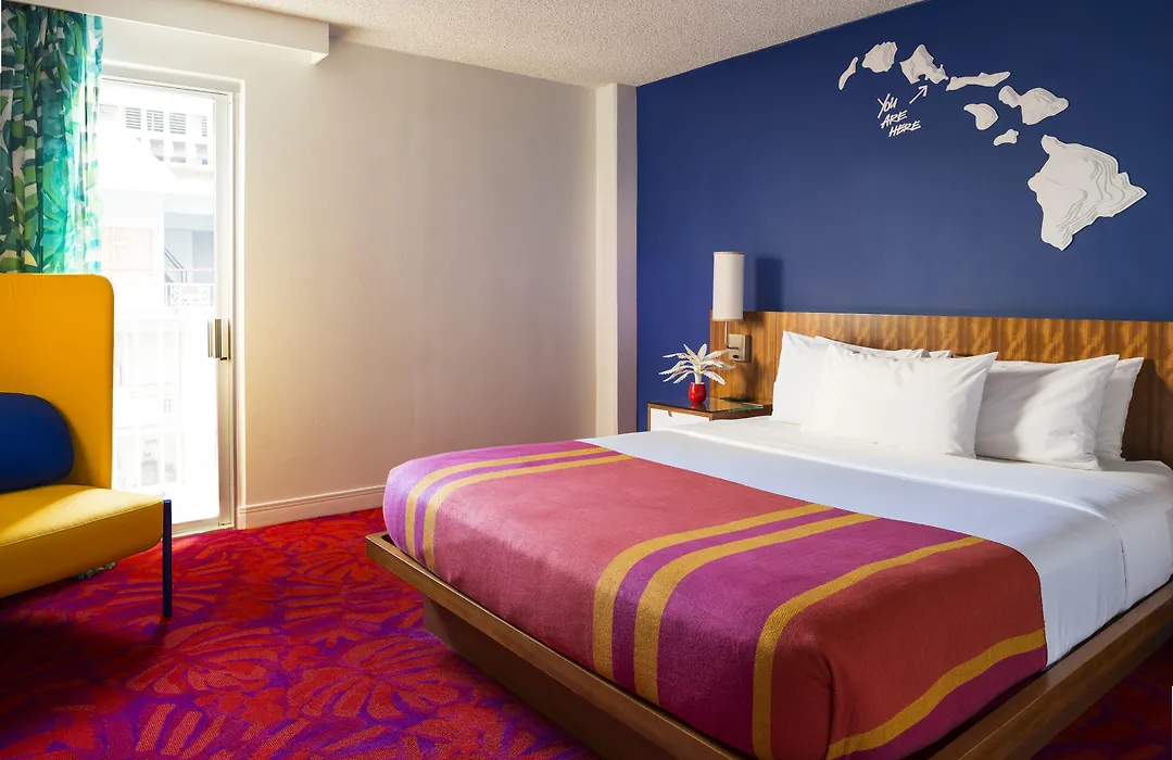 Shoreline Hotel Waikiki, a 4-star boutique hotel, features a vibrant redesign by BHDM Design that incorporates colorful neon elements and artwork throughout the property. Guests can enjoy convenient amenities like complimentary WiFi, a rooftop pool, and an on-site restaurant serving local dishes.