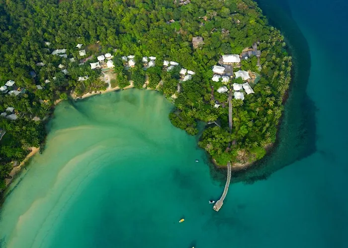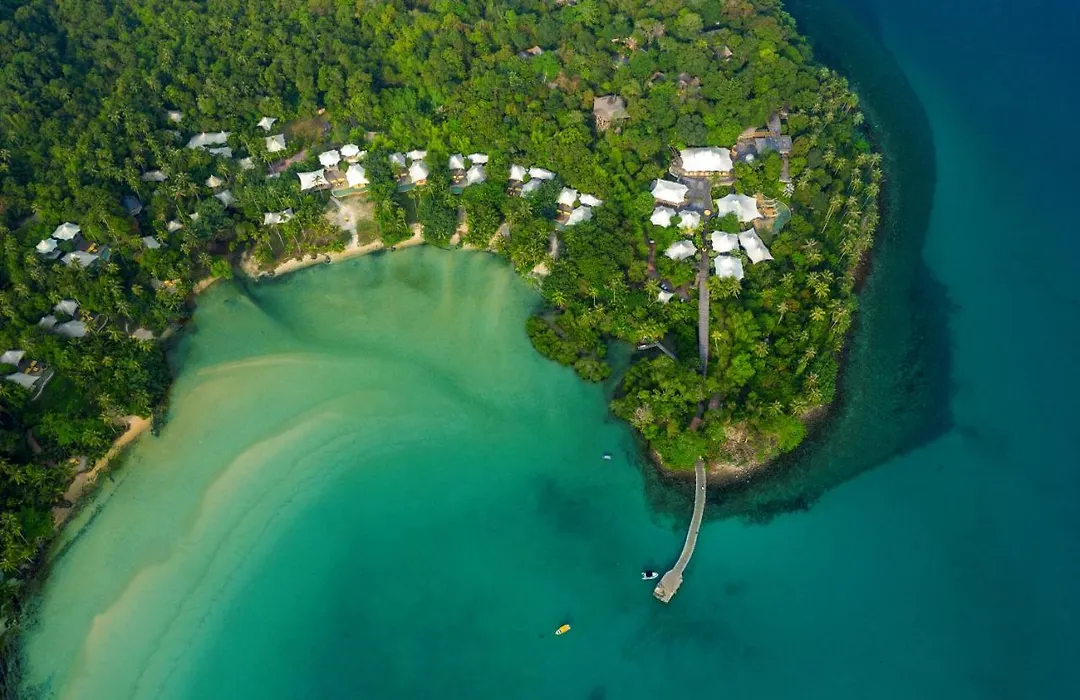 Soneva Kiri, a 5-star luxury resort, offers private pool villas and gourmet dining with a no-menu concept, set within lush jungles and stunning waterfalls. Additional amenities include a spa, private air transfers, and an array of activities reflecting the region's natural beauty.