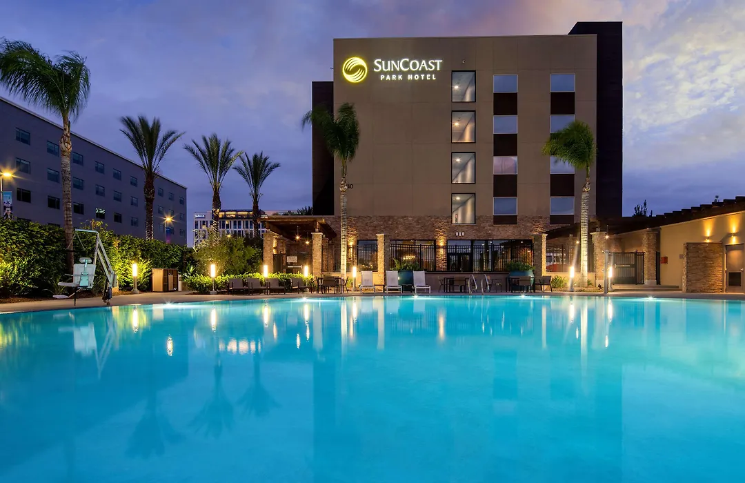 Suncoast Hotel Anaheim, Tapestry Collection By Hilton, a 4-star family-friendly hotel, features a heated outdoor pool and an onsite pub serving small bites and cocktails. Guests enjoy amenities like free WiFi and in-room dining options in a modern setting.