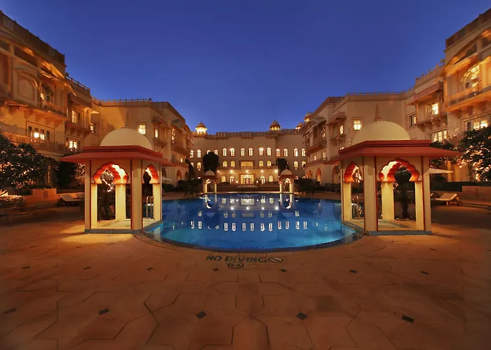 Taj Hari Mahal Jodhpur, a 5-star hotel rated 8.9/10 on Booking.com, features luxurious accommodations reminiscent of a 14th-century royal palace. The hotel offers a grand lobby, a vast swimming pool, a spa, and a 24-hour fitness center.