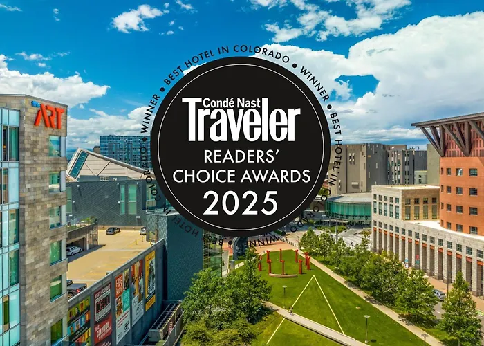 The Art Hotel Denver, Curio Collection by Hilton, is a 4-star hotel with an 8.2/10 rating on Booking.com, situated in a culturally vibrant area known for its art scene. Guests can enjoy on-site amenities, including the FIRE Restaurant, rooftop FIRE Terrace, and 24-hour fitness center, while surrounded by a curated collection of contemporary art.