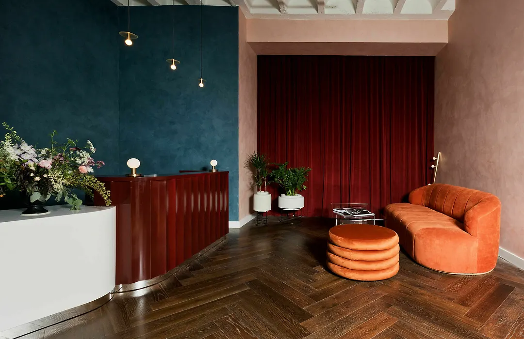 Guestrooms feature high ceilings, original tilework, elegant archways, and exposed brick walls. Complimentary Wi-Fi, Smart TVs, and free bottled water are standard in accommodations, providing a luxurious experience for guests seeking modern comforts.
