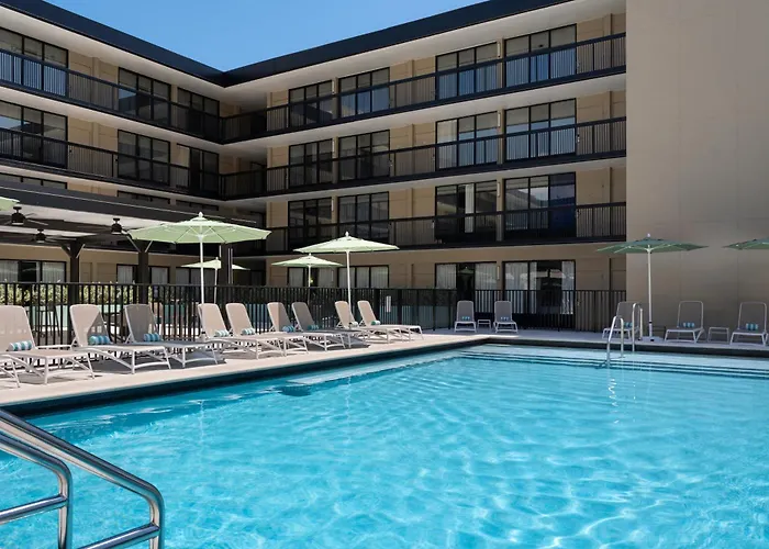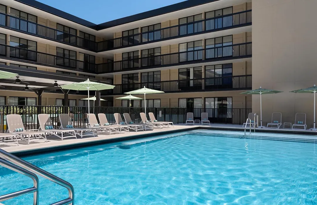 Recreational facilities include a heated pool surrounded by lush landscaping, providing a relaxing atmosphere. Guests can explore nearby attractions such as the Hollywood Boardwalk and ArtsPark, just a short distance away. The hotel hosts events and live performances, contributing to its vibrant community presence.