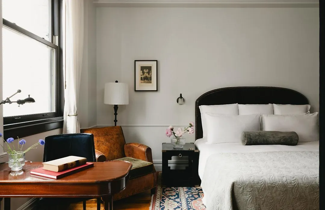 The Ned Nomad features a variety of rooms, including cozy 340-square-foot accommodations with a king-size bed, mahogany writing desk, and club chairs. Each room is equipped with a walk-in rainforest shower and a collection of full-size Cowshed products. Additional options include spacious one-bedroom suites with oversized bay windows offering panoramic city views.