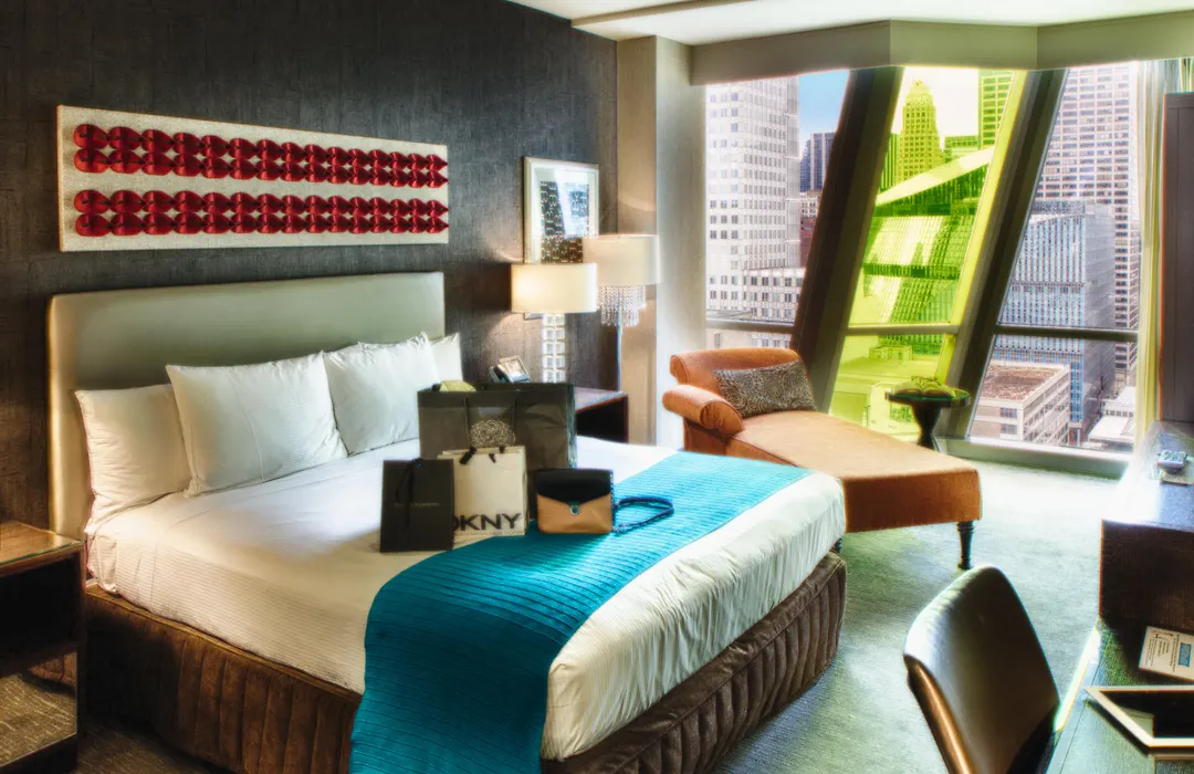 Stylish rooms at Thewit Chicago feature luxurious touches and spectacular views of Chicago's architecture. The spacious Luxury Spa King One Bedroom Suite includes an oversized spa bathroom with a non-jetted soaking tub and a separate glass-enclosed shower. Other room types, such as the Classic Two Queen Room, offer similar high-end features and views.