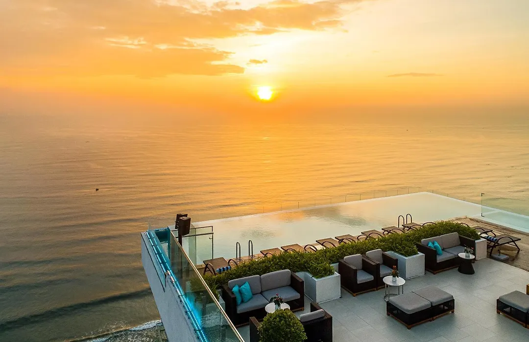 Tms Hotel Da Nang Beach, a 5-star Danang hotel with a 9.2/10 rating on Booking.com, features a stunning infinity rooftop pool and a diverse range of dining options. This family-friendly accommodation offers direct beach access along with modern amenities such as a fitness center and spa services.