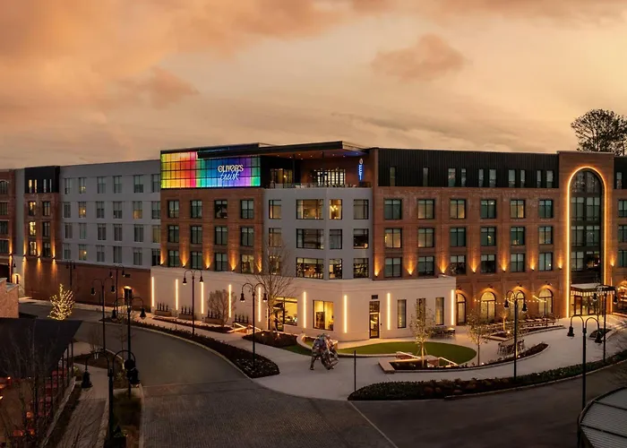 Dining options include Prologue Dining & Drinks, serving Southern-inspired cuisine, and Oliver's Twist Bar & View, featuring elevated pub fare and creative cocktails. Guests can enjoy exquisite views of the Town at Trilith from the rooftop bar.