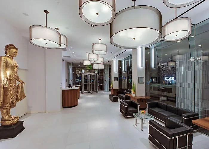 Wyndham Garden Chinatown offers modern accommodations in the heart of NYC with a 4-star rating and a Booking.com score of 7.4/10. Guests enjoy amenities like a rooftop bar, a street-level beer garden, and a 24-hour fitness center. This pet-friendly hotel features stylish rooms with floor-to-ceiling windows showcasing stunning city views.