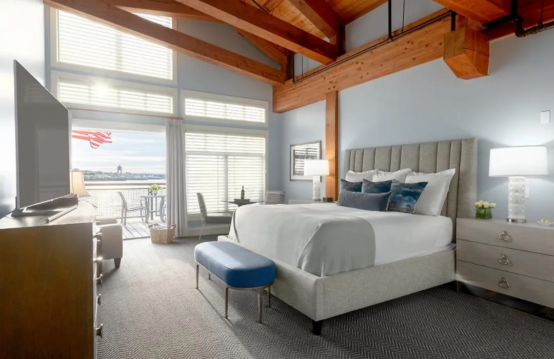 The Guest Rooms and The Penthouse at Boston Yacht Haven provide exceptional modern-day amenities, including large flat-screen TVs, Bluetooth clock radios with wireless charging, and heating features in the bathroom. Select rooms offer panoramic city and harbor views, along with luxurious furnishings and a pull-out sofa bed.