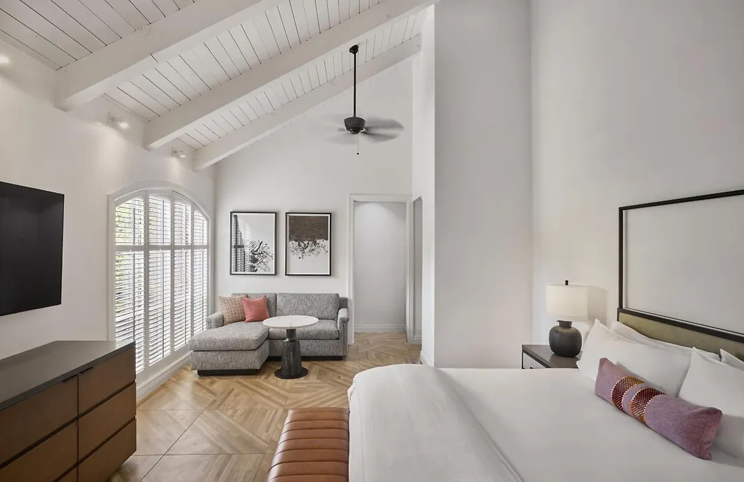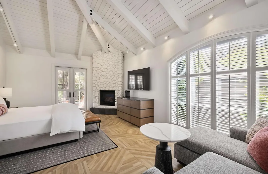 Rooms at Hotel Yountville include elegant amenities such as four-poster beds and oversized sunken tubs. The Yountville Suite spans 1100 square feet and features vaulted ceilings, fieldstone fireplaces, and two outdoor patios.