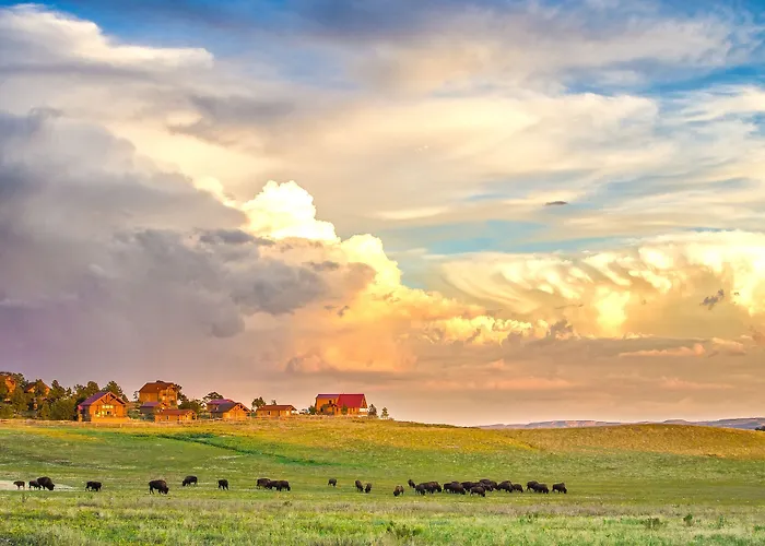 Guest accommodations include a range of private cabins and lodges, such as Lodge 128, which features a private sauna and expansive views of the Buffalo Preserve. Other options include lodges that offer full kitchens, spacious decks, and beautiful canyon views, accommodating various group sizes up to 15.