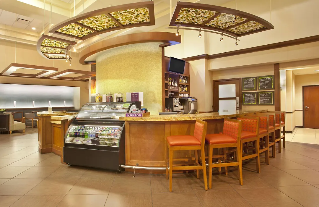 Dining options include The Placery, which offers a carefully curated menu alongside the Breakfast Bar serving fresh fruit, yogurt, and a variety of hot breakfast selections. Additionally, guests can try popular items like burgers and Chicken Caesar Salad paired with premium beverages.