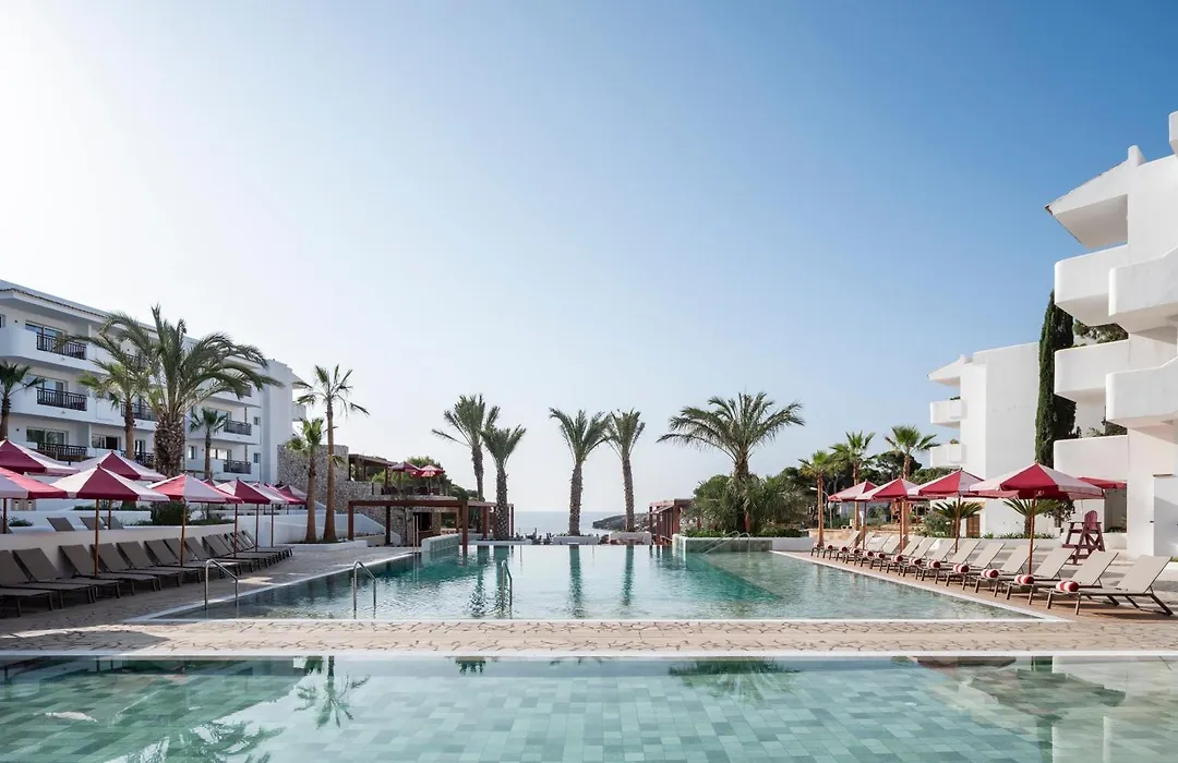 Leisure facilities feature two outdoor lagoon pools, an adults-only pool, and access to Cala Esmeralda Beach for snorkeling and swimming. Guests can participate in activities such as yoga, team sports, and bike rentals to explore nearby Mondragó Natural Park, just 4.3 miles away.