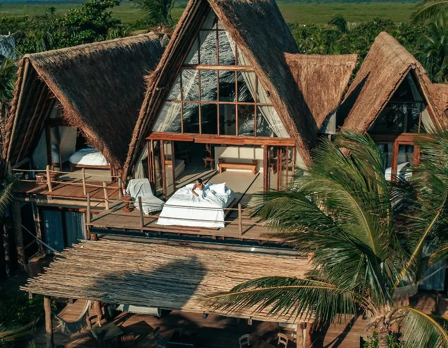 La Valise Tulum, Member Of Small Luxury Hotels, is a 5-star Tulum hotel featuring rustic jungle bungalows with terraces offering jungle views and a heated infinity pool overlooking both the jungle and Caribbean ocean. Guests can enjoy beachfront dining, beach massages, and complimentary breakfast.