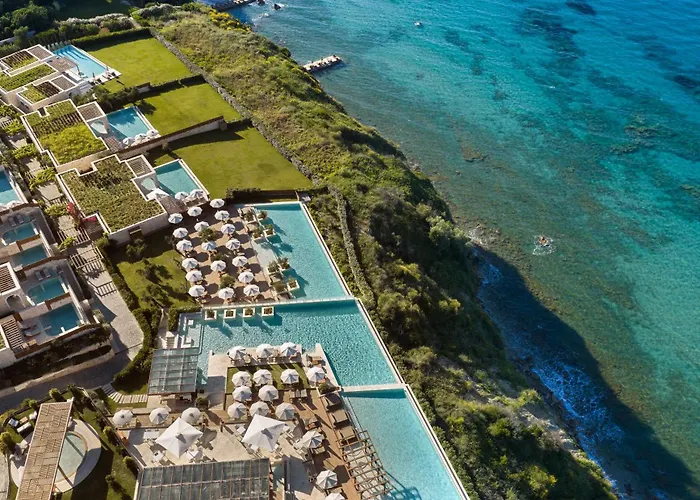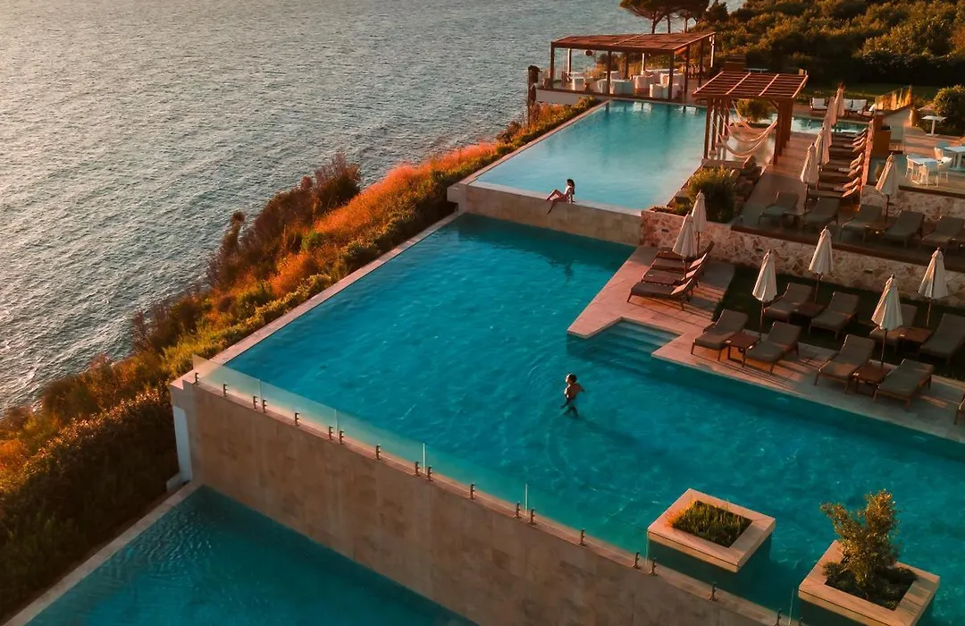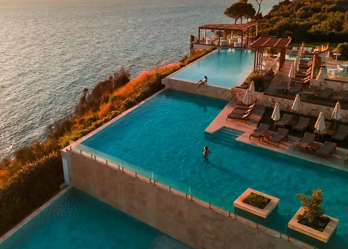 Lesante Cape - The Leading Hotels Of The World is a 5-star luxury resort featuring a private beach, high-end gastronomy options, and a world-class spa. The hotel showcases traditional Akrotirian architecture amid lush landscapes and stunning views of the Ionian Sea. With a 9.4/10 Booking.com rating, it offers a unique hospitality experience in Akrotiri (Zakynthos).