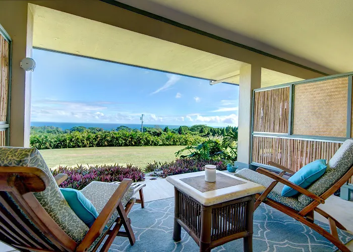 Mahana House Country Inn, a 4-star North Hilo hotel rated 9.5/10 on Booking.com, offers a peaceful retreat on an 11-acre fruit farm. Guests enjoy ocean views, free WiFi, and access to shared facilities including a full kitchen stocked with essentials.