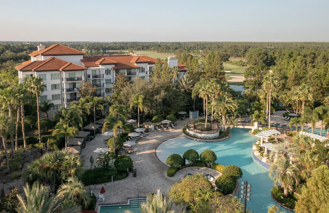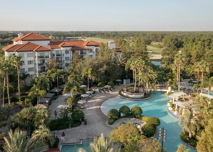 The resort features a zero-entry outdoor pool complex with waterslides and whirlpool spas. Guests can enjoy access to championship golf courses and nearby attractions such as SeaWorld Orlando and Discovery Cove, all contributing to an array of family-friendly activities.