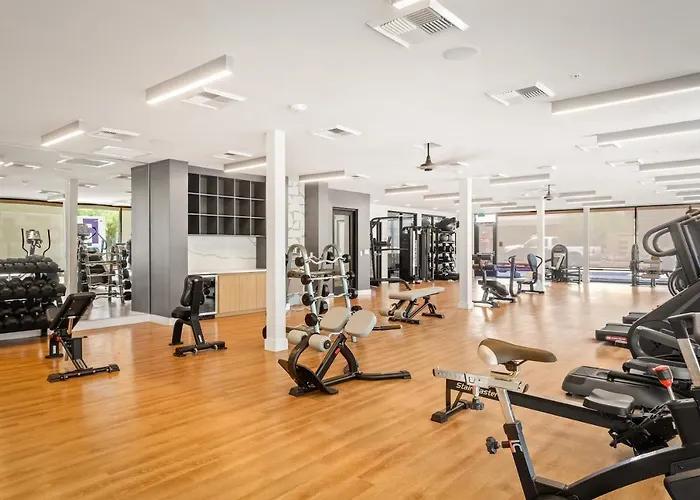 The wellness area consists of a hot tub and fitness room for guest relaxation. The outdoor swimming pool serves as a focal point for leisure and social activities.