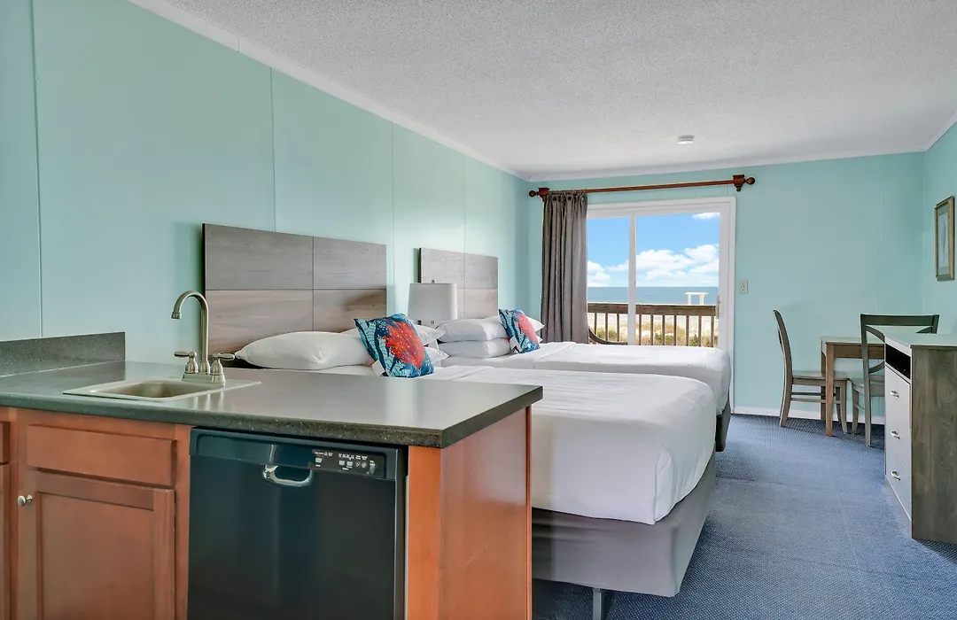 Guest accommodations at Admiral'S Quarters feature various room types, including double queen and oceanfront suites. Many rooms are equipped with full kitchens, microwaves, mini-fridges, and coffee makers, providing flexibility for meal preparation. Balconies offer views of the pool or the sea.