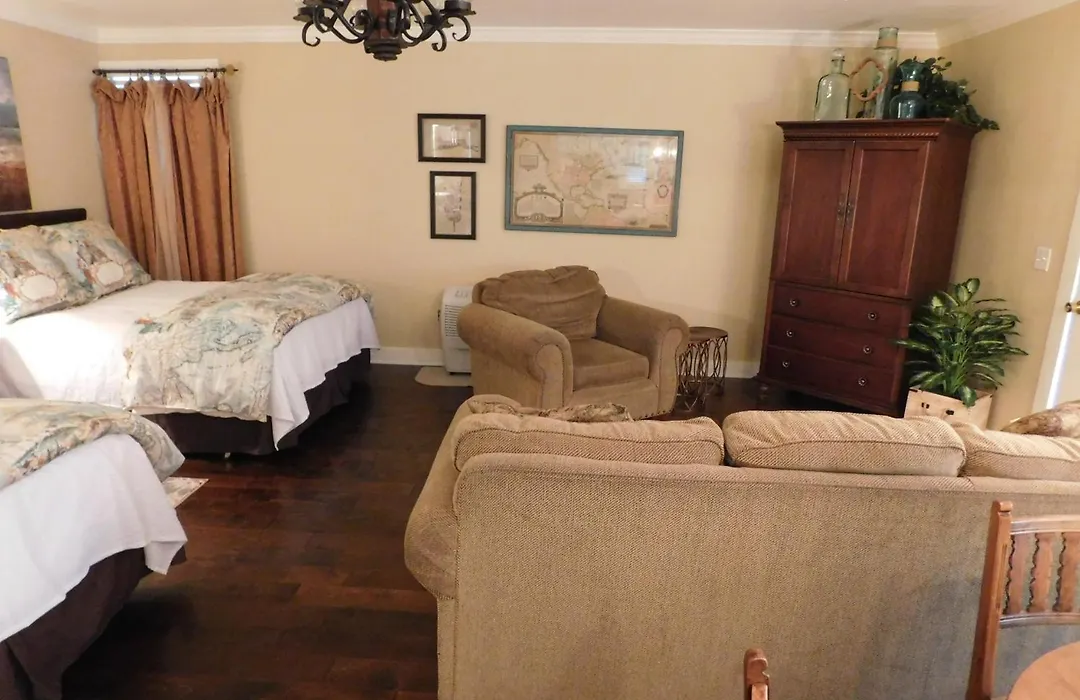 Rooms at Rainbow Courts include Single Queen rooms and larger Signature Queen rooms, furnished with antiques and premium linens. The cottages feature a wet bar and private back deck overlooking the central lawn, accommodating longer stays with kitchen facilities.