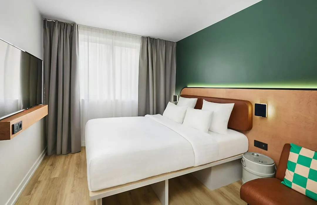 Rooms at Moxy Paris Bastille are designed to maximize space, featuring gray and lime-green color schemes, motion-activated LED guidelights, and walk-in showers. Some rooms include terraces or balconies with views of Paris rooftops or the courtyard. Each room is equipped with a 49'' LCD TV and complimentary Wi-Fi.