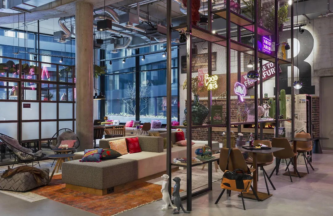 For leisure, Moxy Frankfurt City Center includes a neon play area with foosball, a modern lounge with a fireplace, and communal tables in the lobby. The hotel's stylish design features vibrant murals and comfortable seating, making it a dynamic space for guests to relax or socialize.