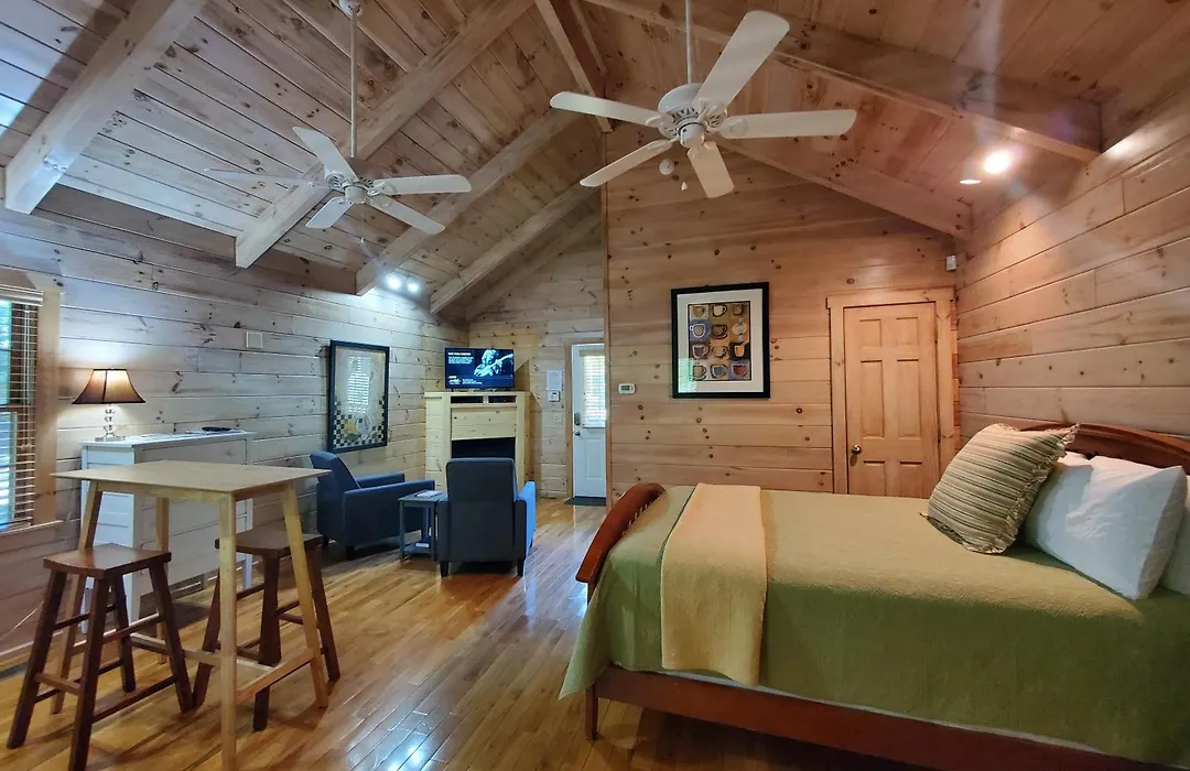 Each cabin features a fully equipped kitchenette, a flat-screen TV with satellite channels, and rockers on the back porch overlooking Chestnut Creek. All accommodations are smoke-free and include air conditioning, heating, and WiFi. The cozy setting allows for private relaxation at your leisure.