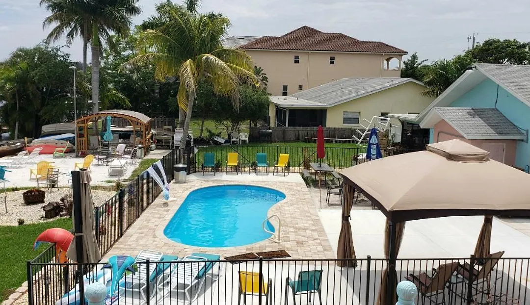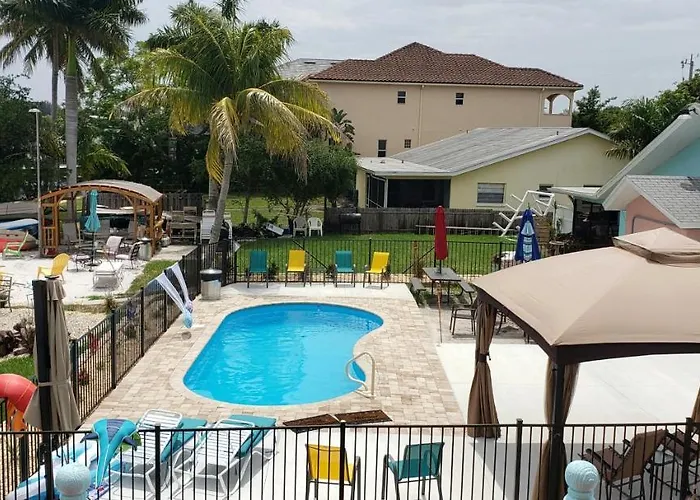 Matlacha On Shoreview offers a 9.1/10 rating with well-equipped condos available for groups and families. Key amenities include a hot tub, outdoor swimming pool, and direct waterfront access for boating activities.