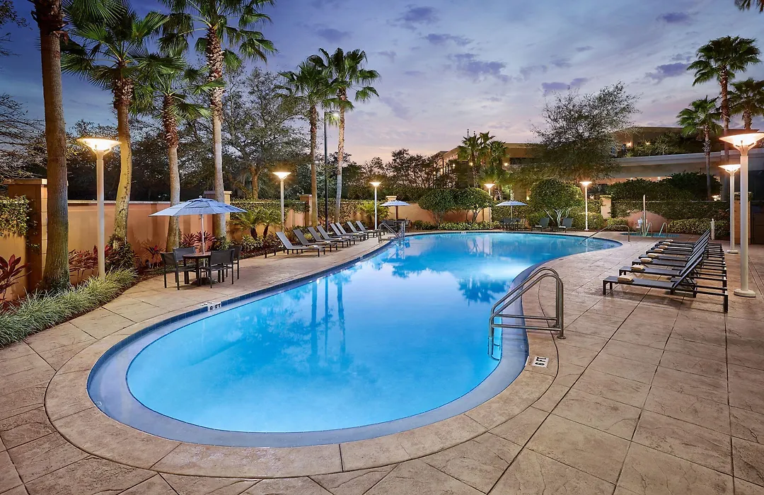 Orlando Marriott Lake Mary, a 3-star hotel rated 8.1/10 on Booking.com, offers 307 newly renovated rooms and suites with modern amenities. Guests can take advantage of a bourbon bar, outdoor heated pool, and extensive meeting space featuring two outside terraces.