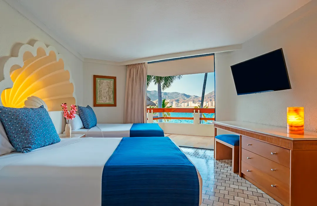Guest accommodations at Park Royal Beach Acapulco include 342 spacious rooms equipped with flat-screen TVs, minibars, and private bathrooms. Options range from partial ocean views to family suites with living areas and plunge pools.