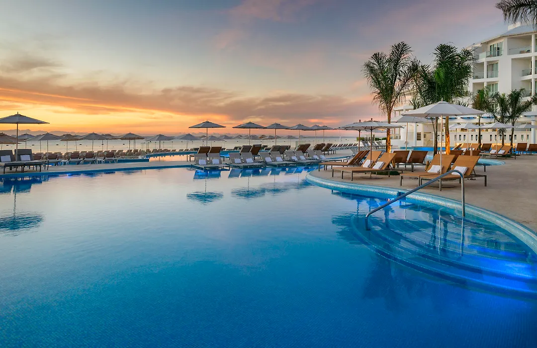 Playacar Palace, a 5-star Playa del Carmen hotel, offers an all-inclusive experience by the beach with upscale amenities including a spa and multiple dining options. Guests can enjoy stunning views of the turquoise waters and white sandy beaches.