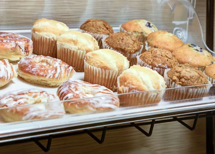 The hotel provides a free breakfast buffet each morning, featuring options like eggs, meat, yogurt, and fresh fruit. Nearby restaurants include Taco Bell, Domino's Pizza, and Fresh Harvest Cafe, all within a 0.5 miles distance.