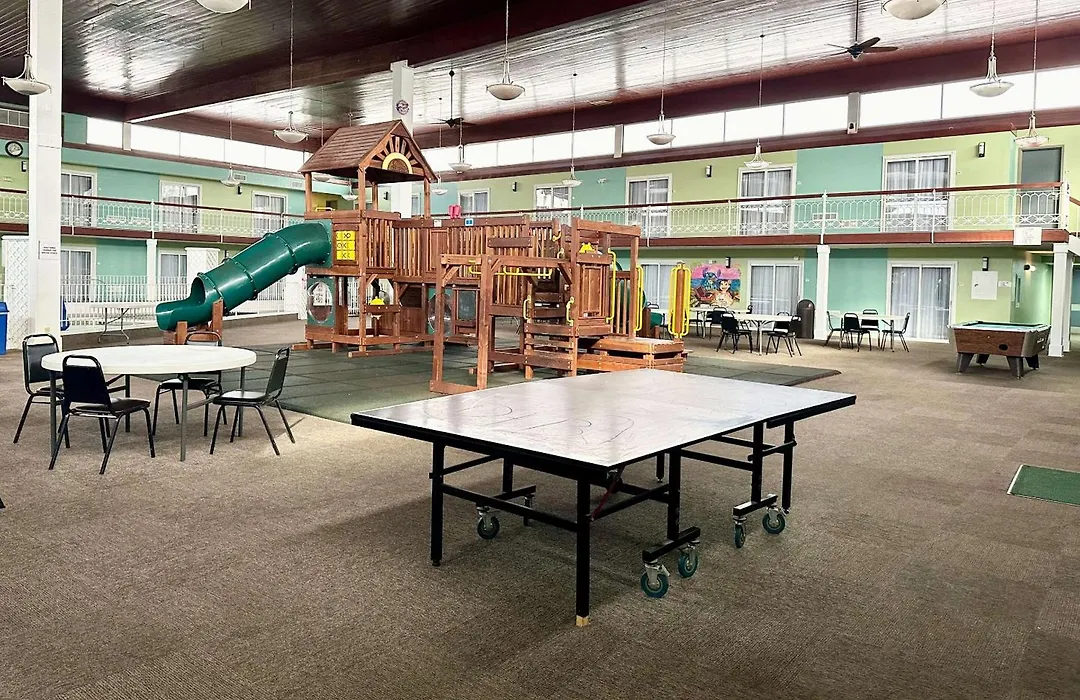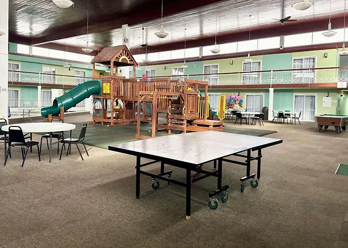 Leisure activities include an indoor pool, fitness center, spa tub, and a game room with pool and air hockey. The surrounding area is ideal for water sports and golf at nearby clubs.