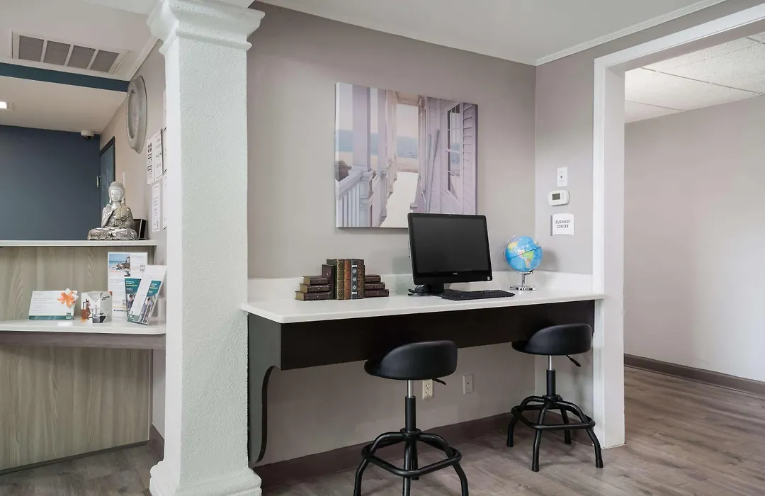 A fitness center is accessible for guest workouts, while the business center caters to work-related needs. The hotel also features a 24-hour reception and vending machines for added guest convenience.