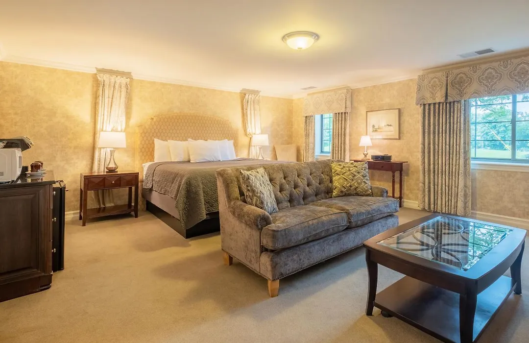 Rooms at Red Coach Inn include a mix of one king and one queen size pillowtop beds, featuring modern amenities like flat-screen TVs and complimentary toiletries. The largest apartment-style suite spans 1230 square feet, catering to guests seeking more space with separate living and sleeping areas, kitchen facilities, and a gas fireplace.